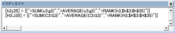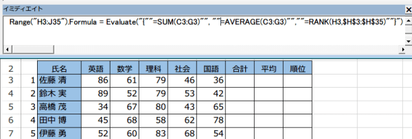 Range("H3:J35").Formula = Evaluate("{""=SUM(C3:G3)"", ""=AVERAGE(C3:G3)"",""=RANK(H3,$H$3:$H$35)""}")