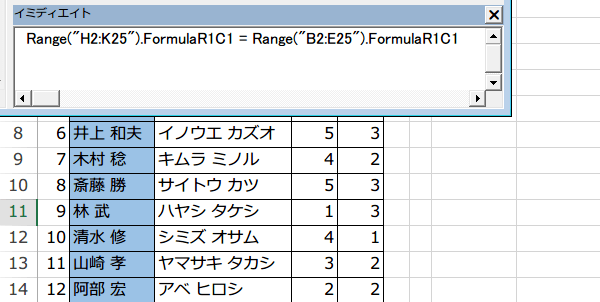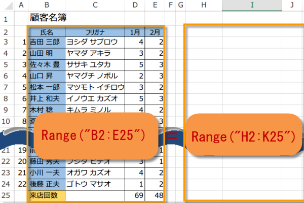 もとのセル範囲Range("B2:E25")の内容をFormulaR1C1で取得し、貼り付け先のRange("H2:K25")に代入します。