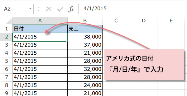 下記の表にある日付はアメリカ式の『月/日/年』で入力されているため、日付としてではなく、文字列として認識されています。