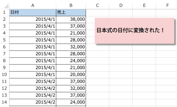 文字列のままでは不便なので、Excelに日付として認識してもらいます。