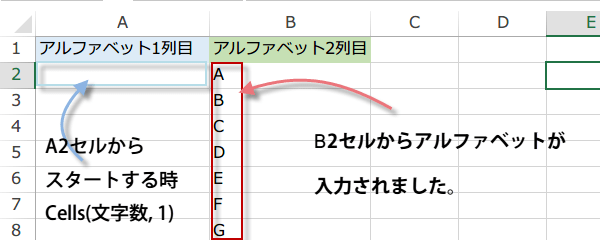 A2セルから入力したい時は、Cells(文字数, 1)とします。