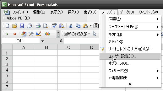 メニューのツールをクリックして、「ツール」メニューを選択し、プルダウンメニューから、「ユーザー設定」を選びます。