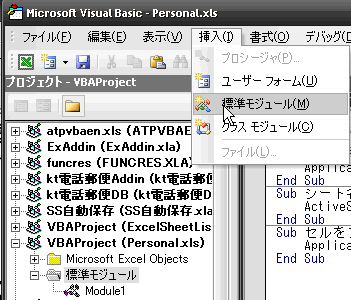 次に、メニューから「挿入」、「標準モジュール」と選択します。
