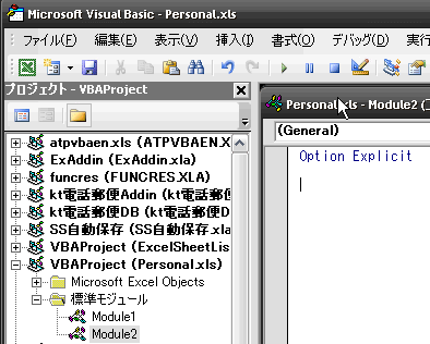 左のPERSONAL.XLSのツリーに新規モジュールが追加されます。