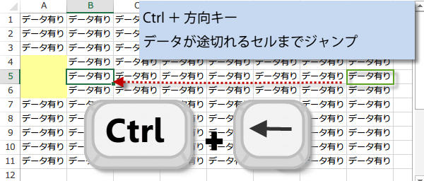 Ctrl + 方向キー(↑↓←→ ) データが途切れるセルまでジャンプ