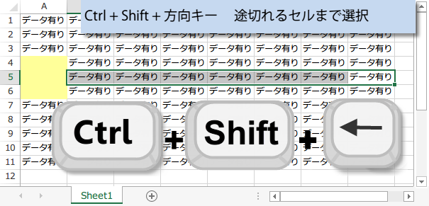 Ctrl + Shift + 方向キー 途切れるセルまで選択