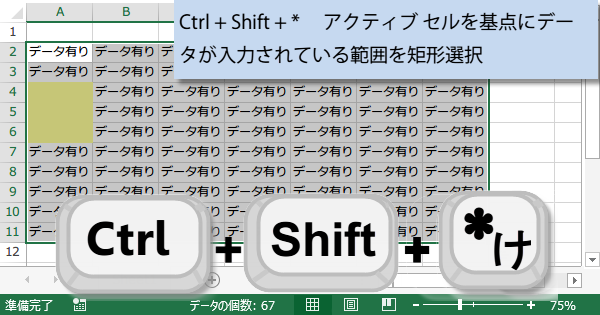 Ctrl + Shift + * アクティブ セルを基点にデータが入力されている範囲を矩形選択※(テンキーの[*]なら[Shift]不要)