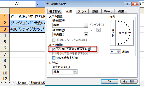 「折り返して全体を表示する」にチェックをして、「OK」ボタンをクリックします。