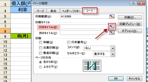 「シート」タブを選択し、[行のタイトル]の入力域の右端のボタンをクリックします。