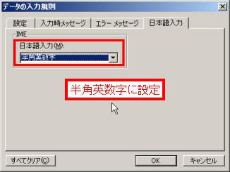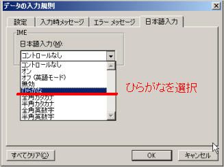 (5) メニューバーの「データ」−「入力規制」をクリック。「日本語入力」タブを選択し、日本語入力の一覧から「半角英数字」をクリックします。OKボタンを押してウインドウを閉じます。(6) これで設定できました。住所と氏名の列では自動的にひらがな入力、郵便番号、電話番号の列では半角英数字の入力になります。