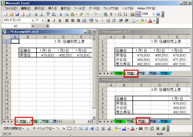 それぞれのウィンドウで見たいシート見出しをクリックすると同一ファイル内の3つのシートがすべて見ることができるようになります。