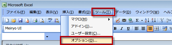 (2)エクセルを起動して、メニューの「ツール」→「オプション」を選択します。