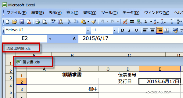 「×」ボタンをクリックしてエクセルを終了し、エクセルを再起動します。「C:\・・・\My Documents\エクセル」に保存されている「請求書.xls」「現金