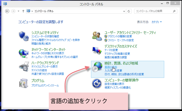 コントロールパネルの時計、言語、および地域から、言語の追加をクリックします。