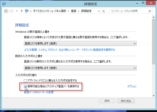 詳細設定ダイアログで、入力方式の切り替えから、使用可能な場にデスクトップ言語バーを使用するにチェックを入れます。