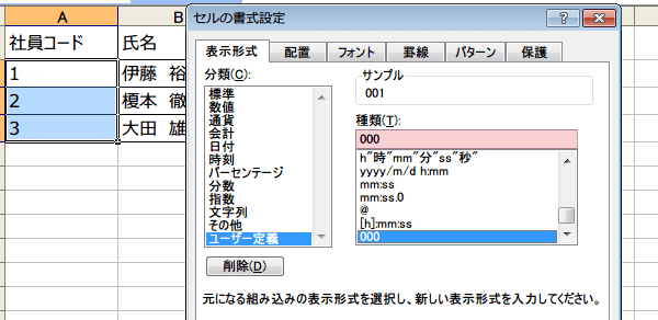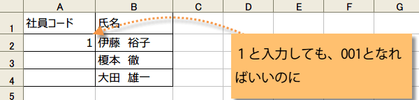 社員コードが3桁の数値になっているなどと言うときに、001と入力しなくても、 1と入力すれば、001と表示されるようにできれば便利です。