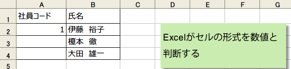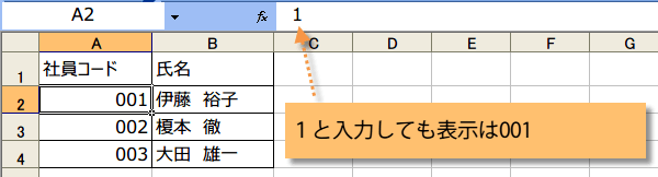 (2)「001」と入力してみましょう。 入力時は「001」ですが、Enterキーを押すと「1」になってしまいます。
