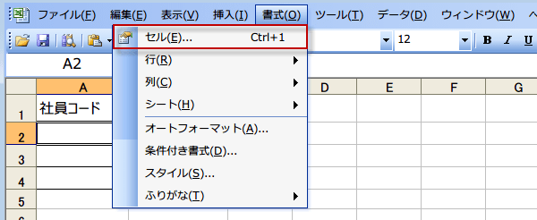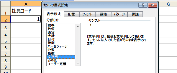 セルの書式設定ダイアログが表示されるので、表示形式を文字列に設定します。