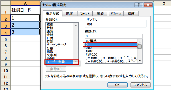このばあい、「ユーザー定義」で最低限表示する桁数を設定することで、数値で表示できます。