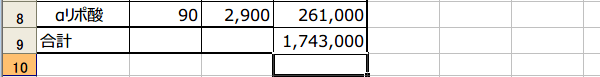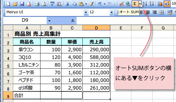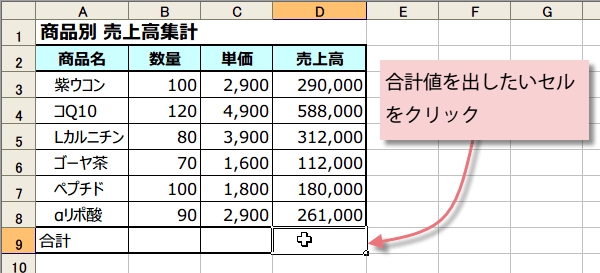 買{タン(オートSUM)で合計値を出すには、まず始めに、合計値を出したいセルをクリックします。この場合、金額の合計値を出したいため「D9」セルを選択しています。