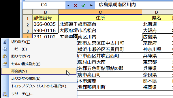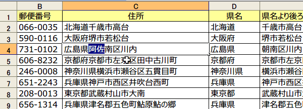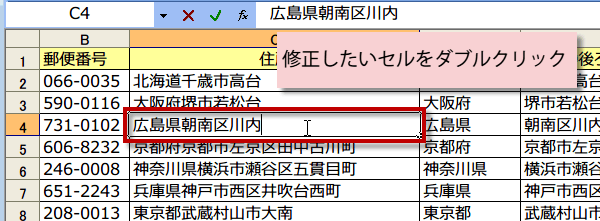 住所などセル内の文字数が多いときに一部分だけを修正したい場合、