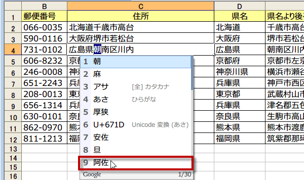 漢字の再変換候補が表示されますので、正しい文字を選びます。この場合、「安佐」を選択しました。「Enter」キーで確定します。