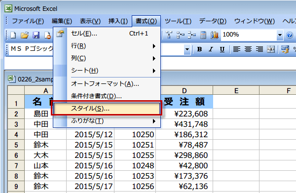 (1)見出しの書式を設定したセルをクリックし、「書式」→「スタイル」を選択します。