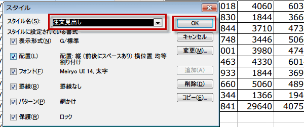 「スタイル名」で名前を付けて保存しておいた「注文見出し」を選択し、「OK」ボタンをクリックします。