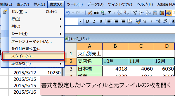 書式を設定しているファイル及び同じ書式を設定したいファイルを開きます。