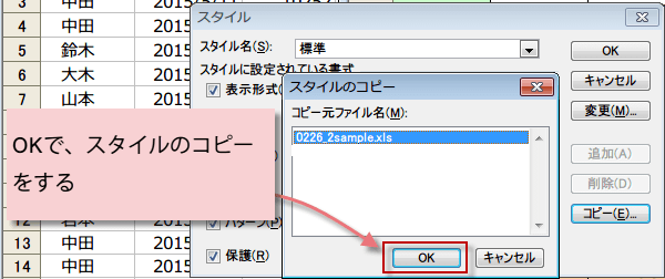 「コピー元ファイル名」で書式を設定しているファイル名を選択(2)、「OK」ボタンをクリックします(3)。