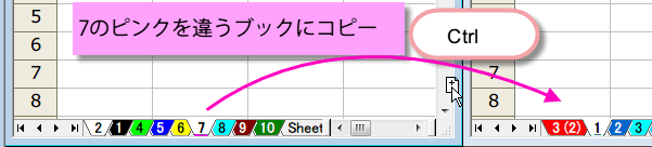 (1)「ウィンドウ」→「整列」→「並べて表示」を実行し、コピー元のワークシートとコピー先のワークシートを並べて表示します。(2)コピーしたいシートの見出しをクリックして、コピーのワークシートの目的の位置まで、「Ctrl」キーを押しながらドラッグします。