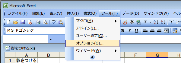 (1)「ツール」→「オプション」をクリックします。