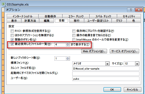 (3)「最近使用したファイルの一覧」のチェックボックスがオンであることを確認し、