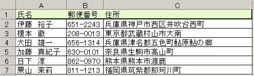 (1)はじめにB列の郵便番号の右隣に空白列を作っておきます。