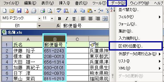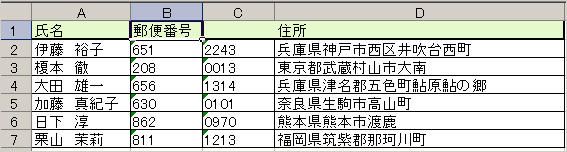 (6)以上で郵便番号の上位と下位が別々のセルに分けられました。