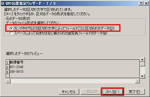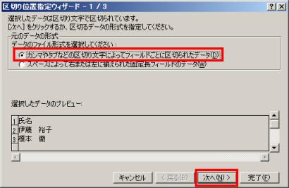 「データのファイル形式」に「カンマやタブなどの区切り文字によってフィールドごとに区切られたデータ」にチェックして、「次へ」ボタンをクリックします。