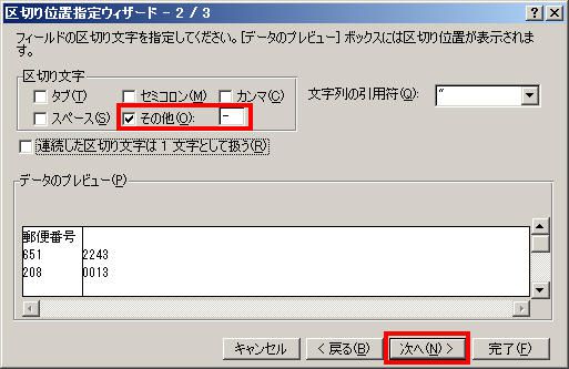 サンプルでは、郵便番号「○○○-○○○○」の「-」を境に2つのセルに分けたいので、「その他」にチェックして「-」と入力します。