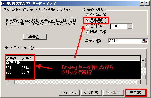 (5)郵便番号の上位3桁の列と下位4桁の列を「Shift」キーを押しながらクリックで選択して、「文字列」にチェックを入れます。