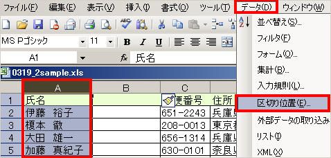 それから、A列を選択して「データ」→「区切り位置」を選択します。