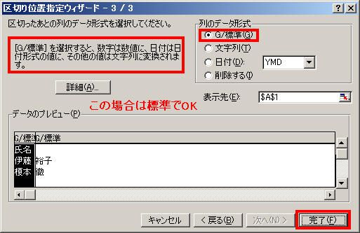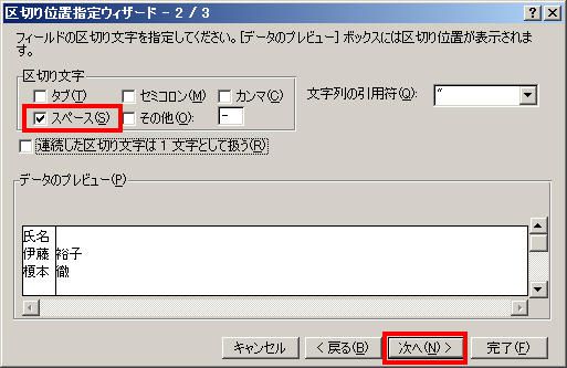 (9)「区切り位置指定ウィザード」を起動してから、「区切り文字」のところで「スペース」にチェックします。データの形式は標準のままです。