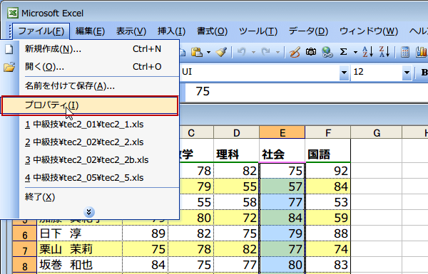 メニューの [ファイル] から [プロパティ] をクリックします。