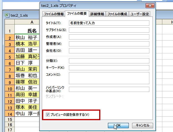 (2)[ファイルの概要] タブで [プレビューの図を保存する] にチェックをつけ、保存します。
