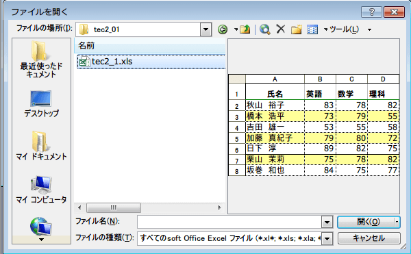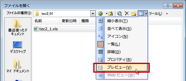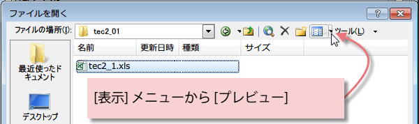 (3)[ファイルを開く] ダイアログで [表示] メニューから [プレビュー] を選択します。