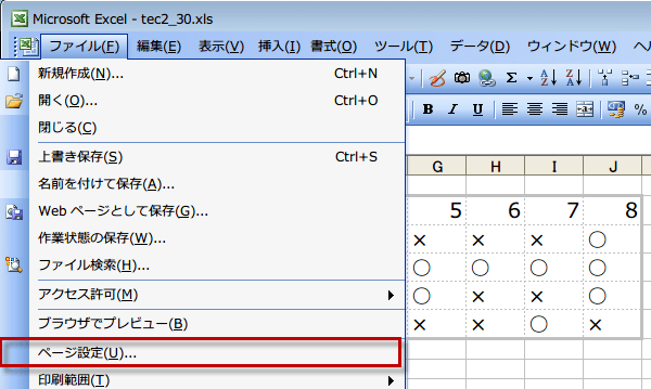 (1)印刷の実行を行なうSheetで、メニューファイル「ファイル」「ページ設定」を選択します。