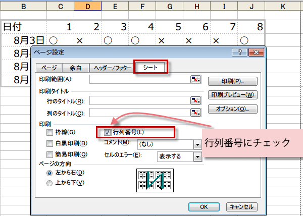 (3)印刷欄の【枠線】と【行列番号】の2つにチェックを入れる