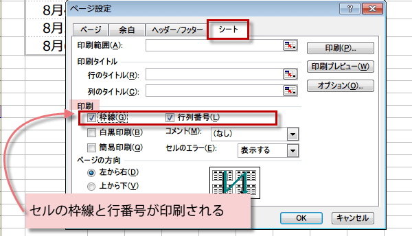 それでは、行列番号とセルの枠線両方印刷するとしたら、どうすればよいでしょう。先ほどのページ設定ダイアログボックスには、枠線の設定もあったのです。