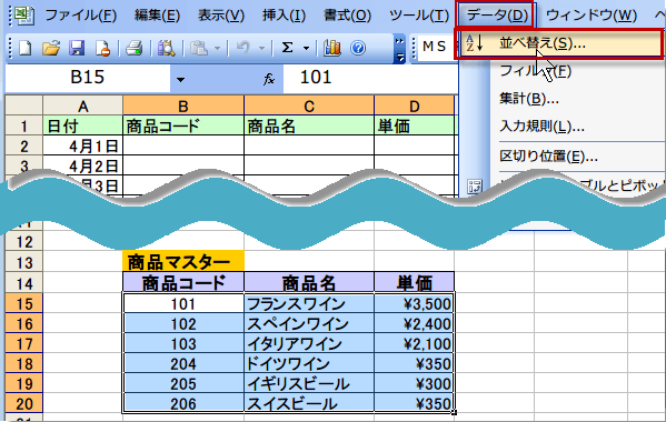 1. 商品マスター内のセル(図では「B15」セル)をクリックし、「データ」→「並べ替え」を選択します。