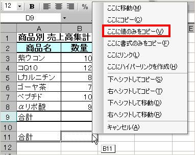 ショートカットメニューが現れるので、「ここに値のみをコピー」を選択します。