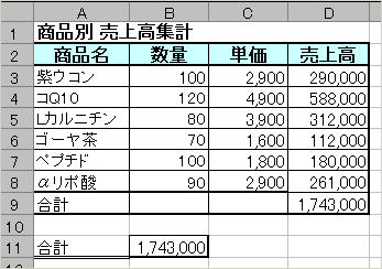 通常のコピーの場合は、「D9」セルをコピーして「B11」セルに貼り付けます。数式バーに「=SUM(B5:B11」と表示され、式がコピーされたのがわかりますね。