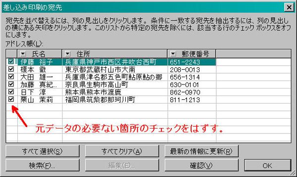 (10)「差込印刷の宛先」ダイアログで元データの必要ない部分のチェックをはずします。